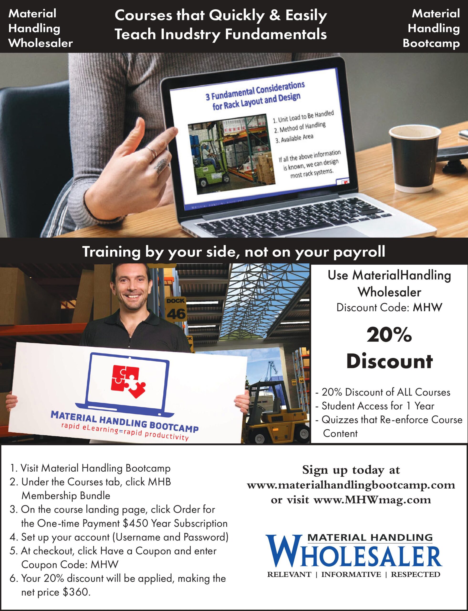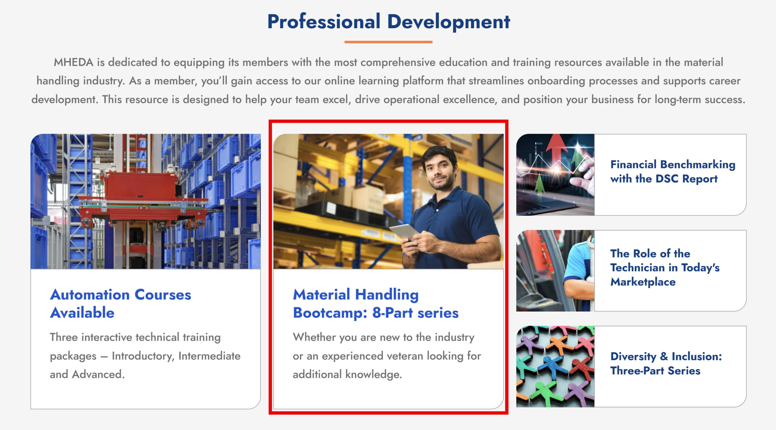 The Material Handling Equipment Distributors Association (MHEDA) offers all members a special discount for Material Handling Bootcamp courses as part of their continuing education program. Our courses are on MHEDA’s own website.